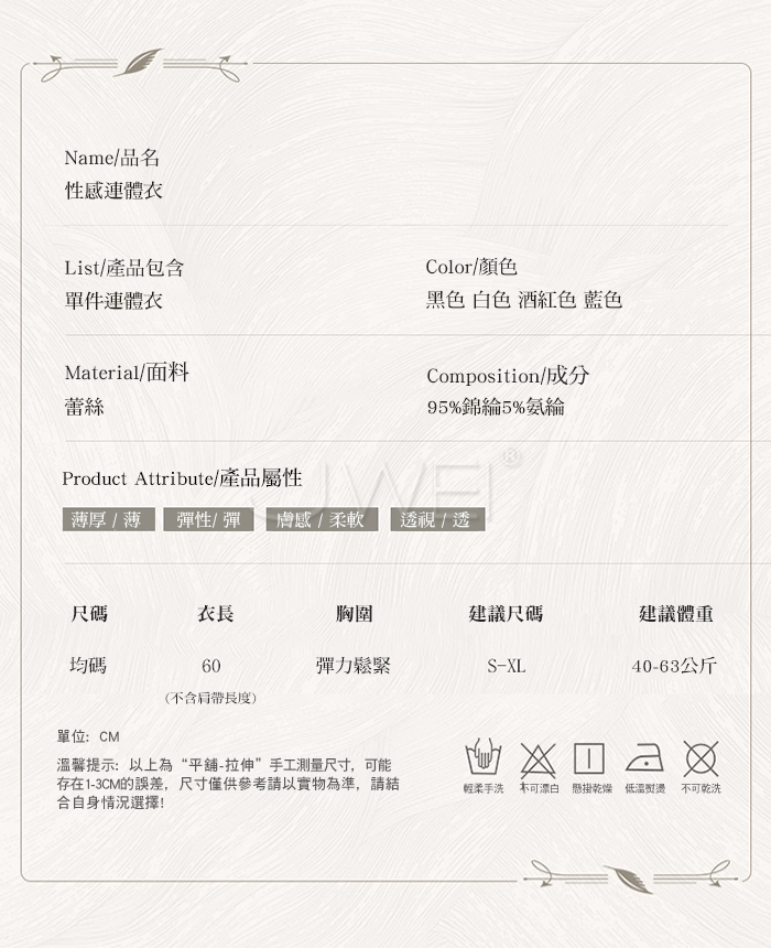 ■內容物:單件連體衣 ■適穿尺寸:FREESIZE ■彈性:彈 ■未撐開平量尺寸正負誤差1~2cm,1吋=2.54cm ■注意事項:基於保障消費者個人衛生,此貼身衣物恕不接受退換貨。 (如為商品本身暇疵,接受七日內換貨,請勿試穿,謝謝您)