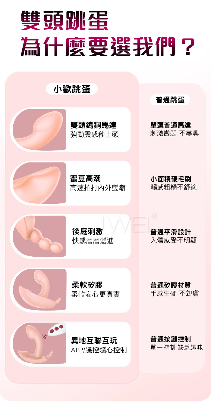 軟彈雙震,秒潮尖叫,全身水洗出玩多重愉悅前戲 外出穿戴,互動調情,多段變頻每一種都爽出新花樣 30種震動組合,從温柔挑逗到欲罷不能,雙頭均為3檔頻7檔變頻 產品規格 ■尺寸:大小詳如圖片標示 ■材質:矽膠 ■特點:10頻震動、APP智控