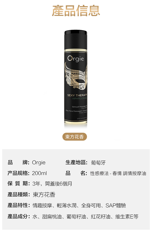 葡萄牙Orgie.Sexy Therapy MASSAGE OIL 性感療法 - 春情 調情按摩油 200ml