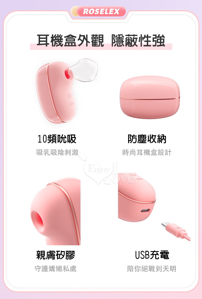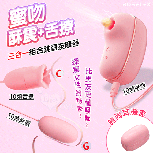 ►您現在的位置:首頁>ROSELEX 勞樂斯 ‧ 蜜吻圓舔款~10頻酥震+舌撩+吮吸三合一組合按摩器﹝時尚耳機盒+USB充電﹞粉