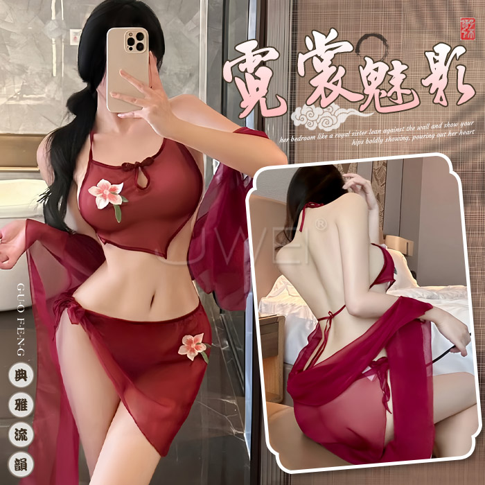 ►您現在的位置:首頁>仿旗袍睡衣!流蘇盤釦立領睫毛蕾絲花卉繫帶露背側開衩兩件組
