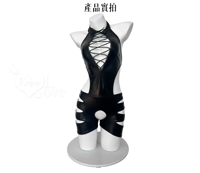 狂野連身衣!掛脖綁帶鏤空大露背漆皮束縛開襠連身衣含襪兩件組