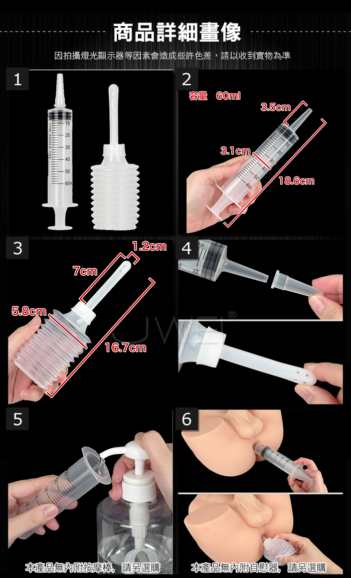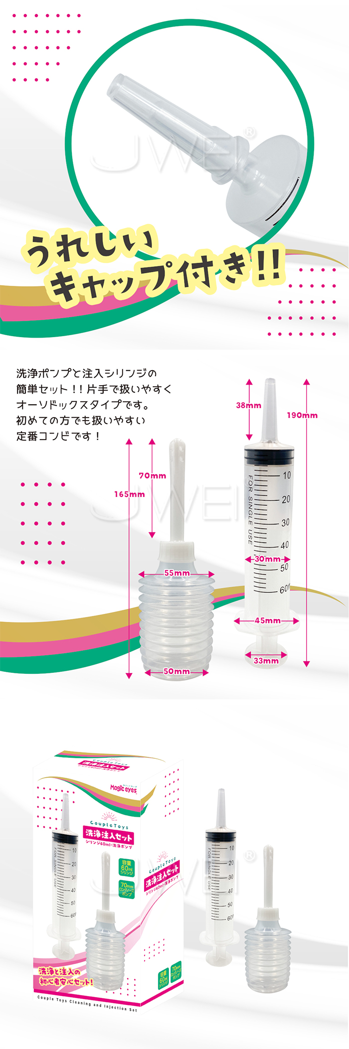 60mlのシリンジと洗浄ポンプの初心者セット! 何を洗浄し何を注入するかはあなた次第! サイズ:洗浄ポンプ 165 × 55 × 55 mm /シリンジ 190 × 64 × 36 mm 重量:洗浄ポンプ 12 g/シリンジ 32 g