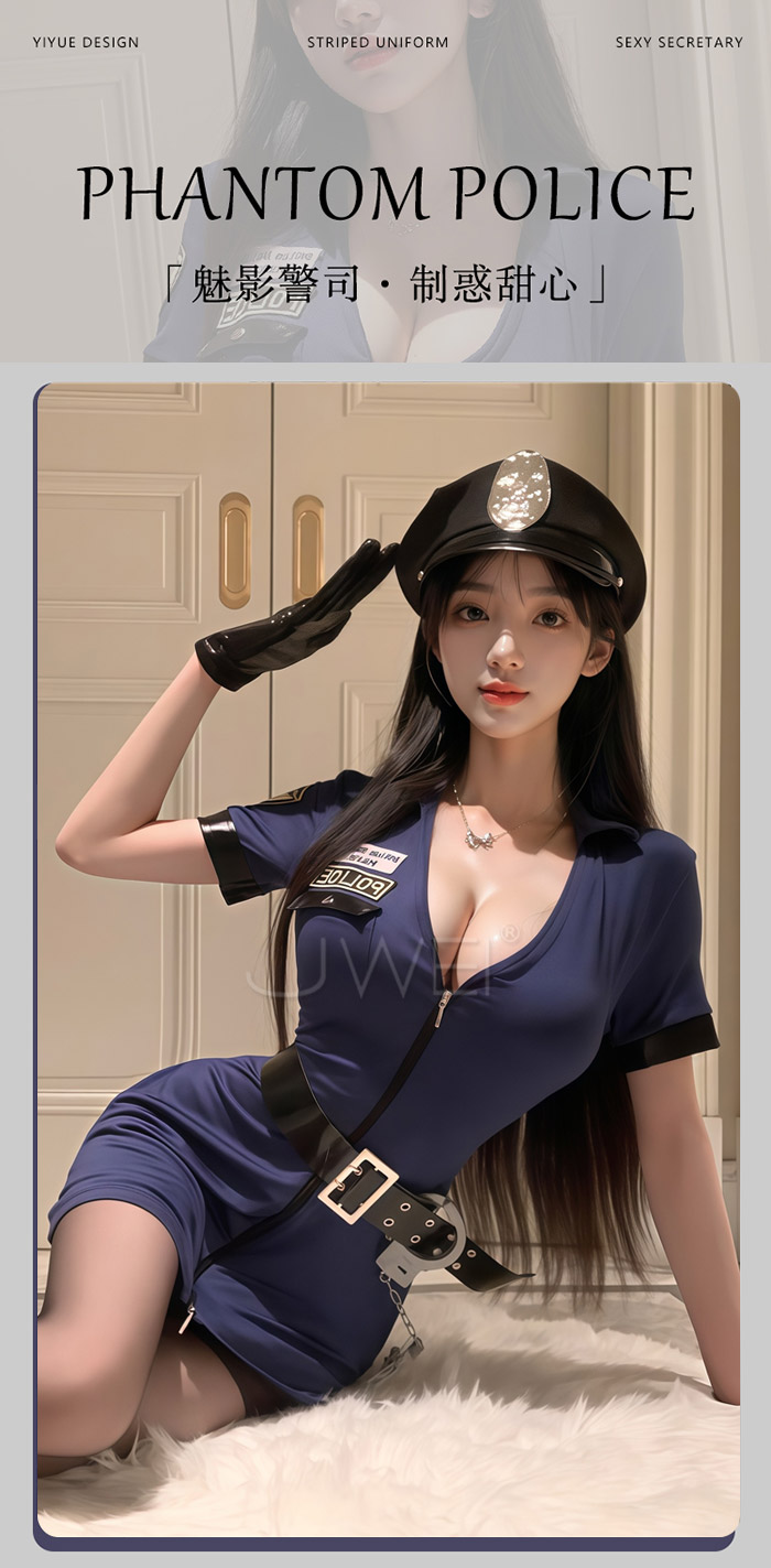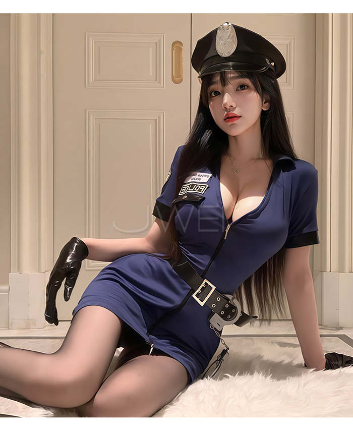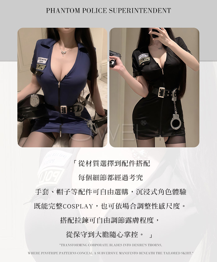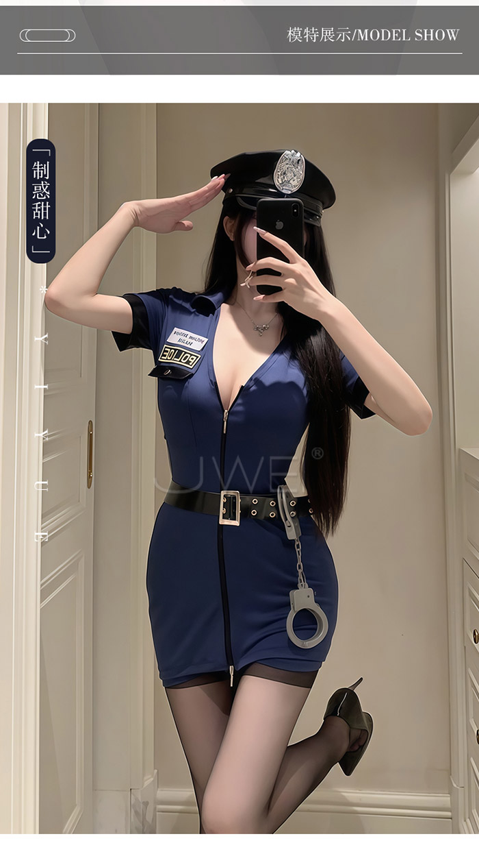 魅影警司.制惑拉鍊調節開胸性感貼身包臀女警套裝-藏藍色【連身褲裙+皮帶+手銬】